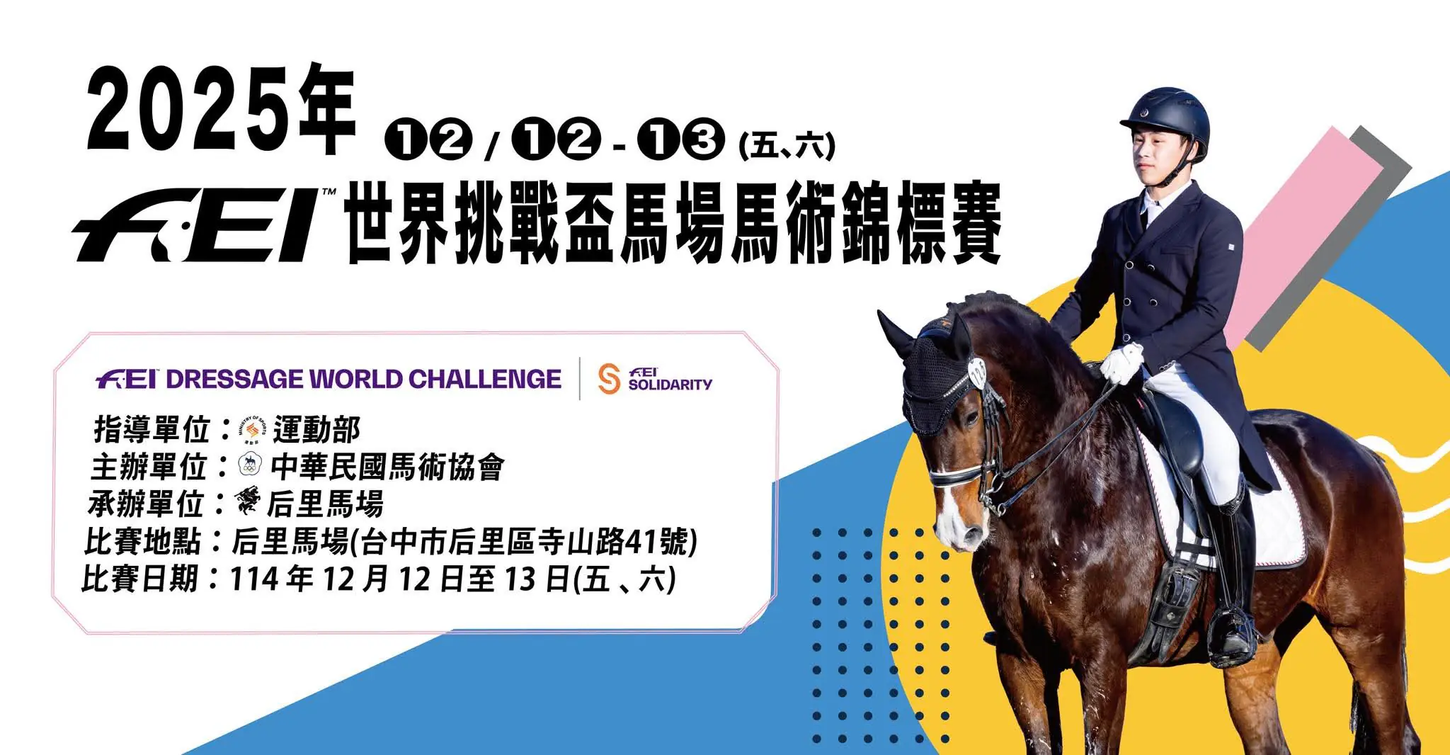 馬術夏令營/冬令營 (17) 休閒馬術體驗/親馬活動 (8) 馬匹照護諮詢活動 (5) 馬匹工作坊/討論會 (4) 馬術賽事 (3) 親馬藝術/公益活動 (3) 目前顯示 1-3 of 3筆 活動 | 全部活動 選城市 Choose City : 三星鄉 中壢區 中山區 中正區 仁愛鄉 仁武區 八德區 八里區 北區 北投區 南區 南區 南投縣 台中市 台北市 台南市 吉安鄉 后里區 員山鄉 員林市 嘉義市 土城區 士林區 壯圍鄉 壽豐鄉 大內區 大園區 大樹區 大溪區 大社區 宜蘭市 宜蘭縣 將軍區 屏東縣 彰化縣 恆春鎮 新北市 新埔鎮 新屋區 新竹市 新竹縣 新豐鄉 東勢區 板橋區 桃園區 桃園市 橋頭區 汐止區 淡水區 湖口鄉 潭子區 澎湖縣 烏日區 神岡區 竹北市 竹南鎮 竹東鎮 臺東縣 芎林鄉 花蓮縣 苗栗縣 萬華區 西屯區 車城鄉 金城鎮 金寧鄉 金山區 金門縣 長治鄉 關廟區 頭城鎮 香山區 馬公市 高雄市 龍井區 龍潭區 龜山區 星期六 , 2025-12-13 , 8:30 上午 ~ 2025年FEI世界挑戰盃馬場馬術錦標賽 臺中 后里馬場 台中市后里區寺山路41號 星期六 , 2025-11-22 , ~ 2025臺北市馬場町馬術邀請賽暨馬術嘉年華 馬場町紀念公園 臺北市萬華區青年路188巷1弄7號 星期五 , 2024-04-12 , ~ 兒童節04/12綠野馬術嘉年華 綠野馬術文創園區 載入中⋯ 展開更多